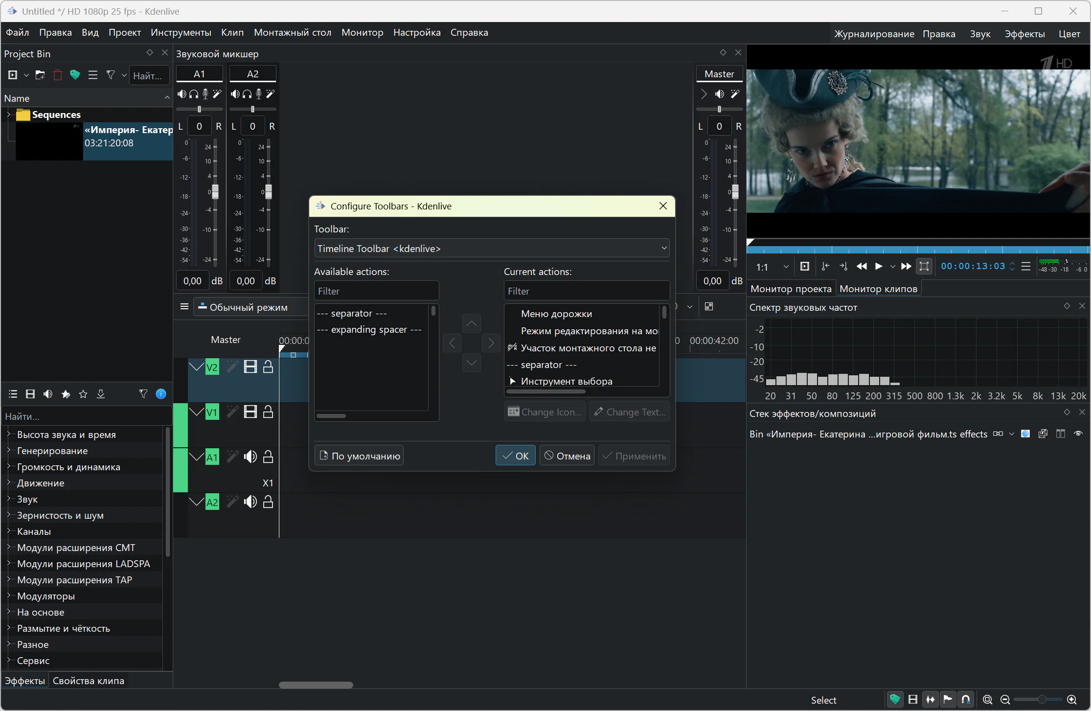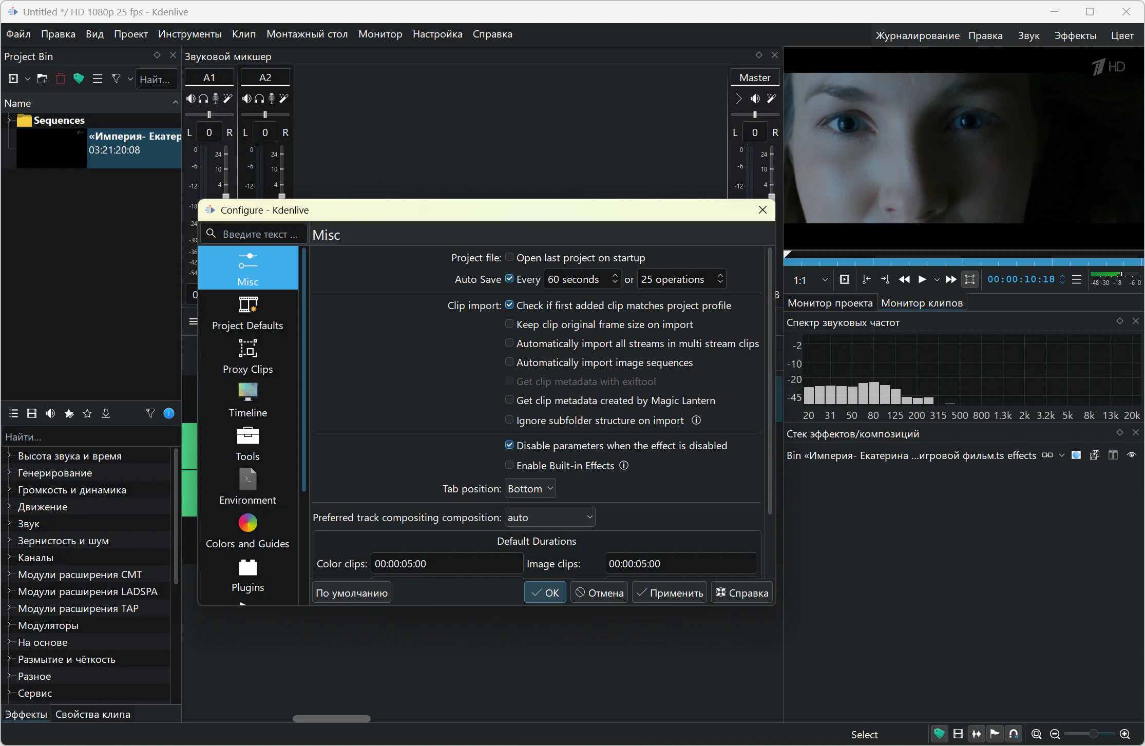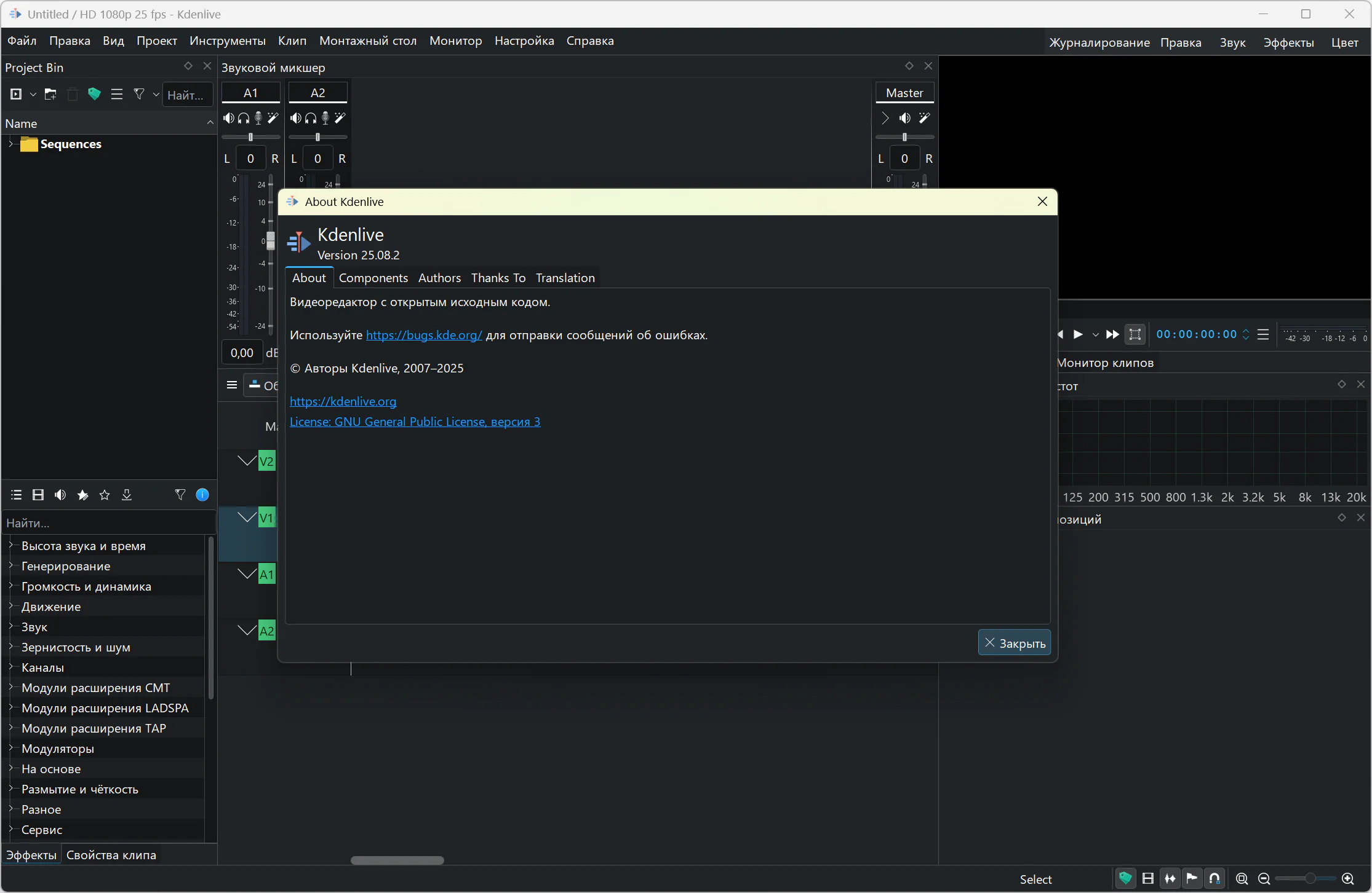 The application can be used as a full-fledged studio for creating videos. There is automatic creation of slide shows from pictures with various transitions and effects, there is a built-in title editor, tools are available for creating, moving, cropping and deleting video, audio, text and graphic fragments. The program includes a variety of audio effects (normalization, phase and pitch shifting, limiting, volume control, reverberation, etc.) and visual effects (blue screen, distortion, rotation, blur, darkening, etc.).